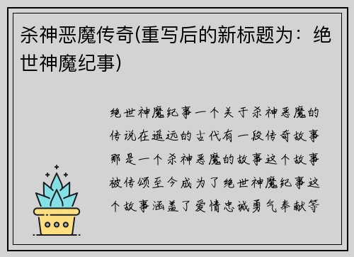 杀神恶魔传奇(重写后的新标题为:绝世神魔纪事)