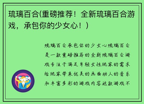 琉璃百合(重磅推荐!全新琉璃百合游戏,承包你的少女心!)